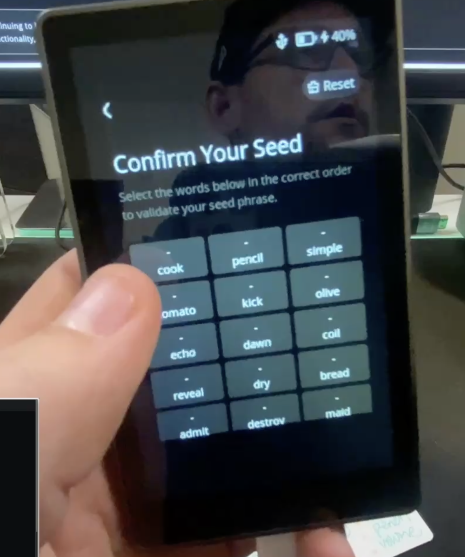 - Confirm the seed phrase by verifying the words in the correct order as displayed on the screen.