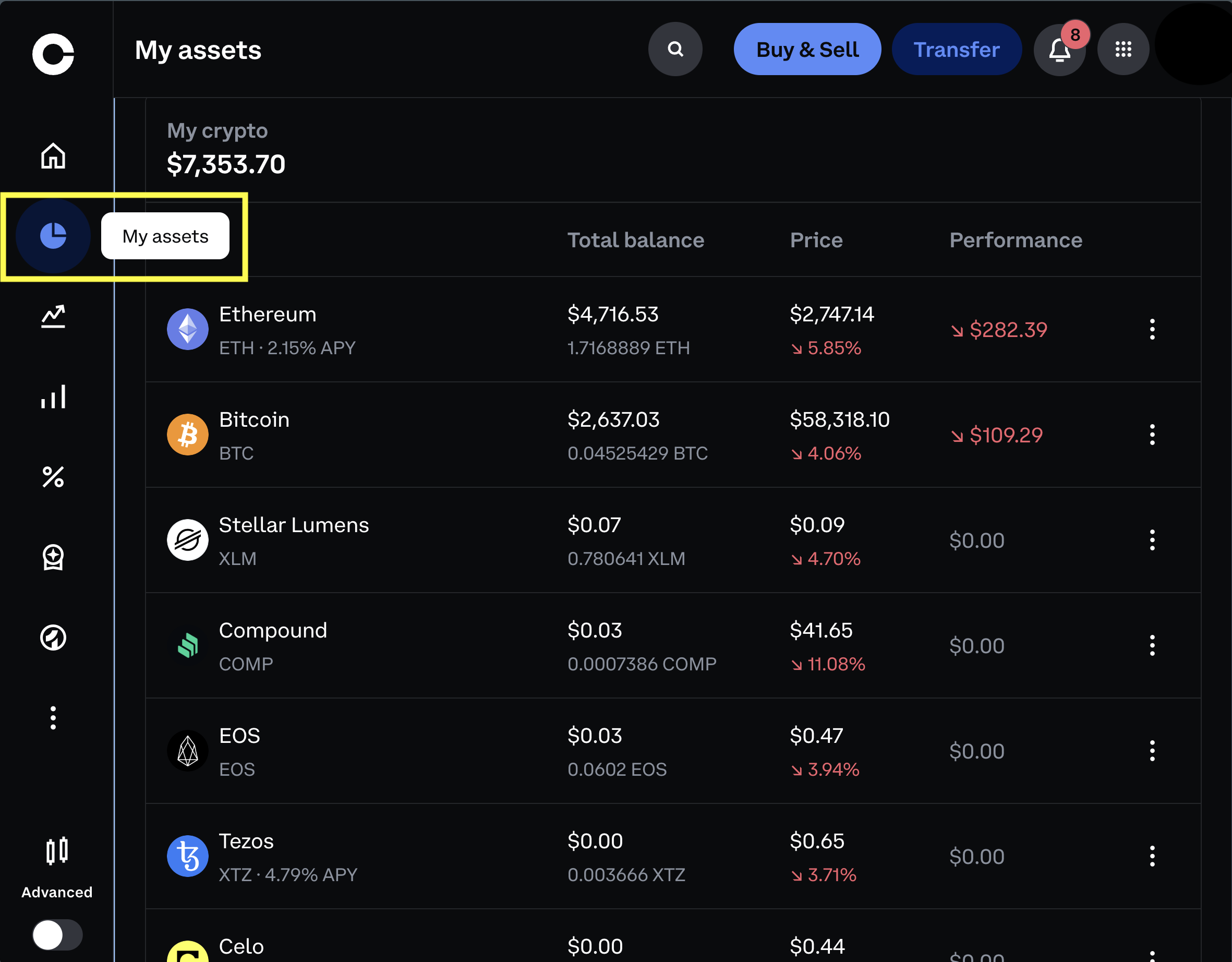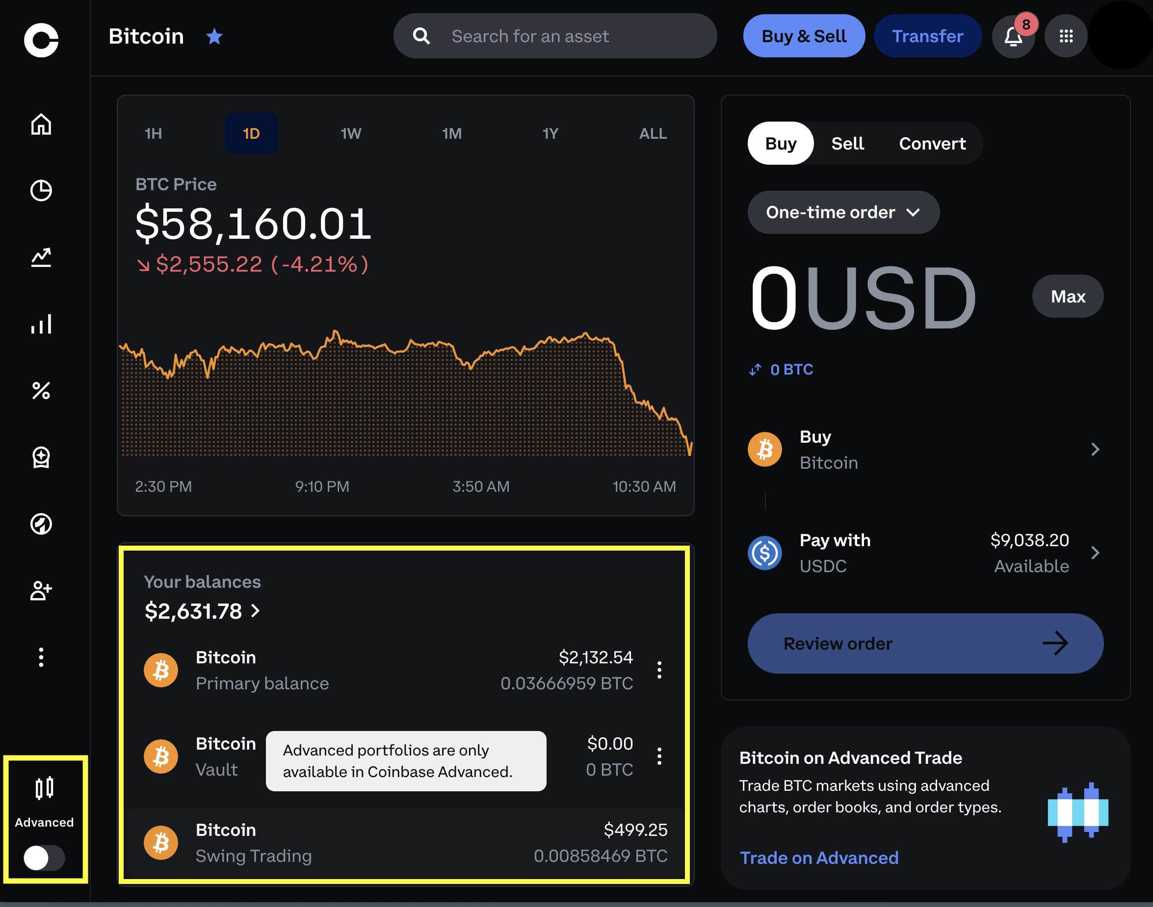 To move to Coinbase Advanced we'll toggle the advanced switch in the bottom left of the screen.