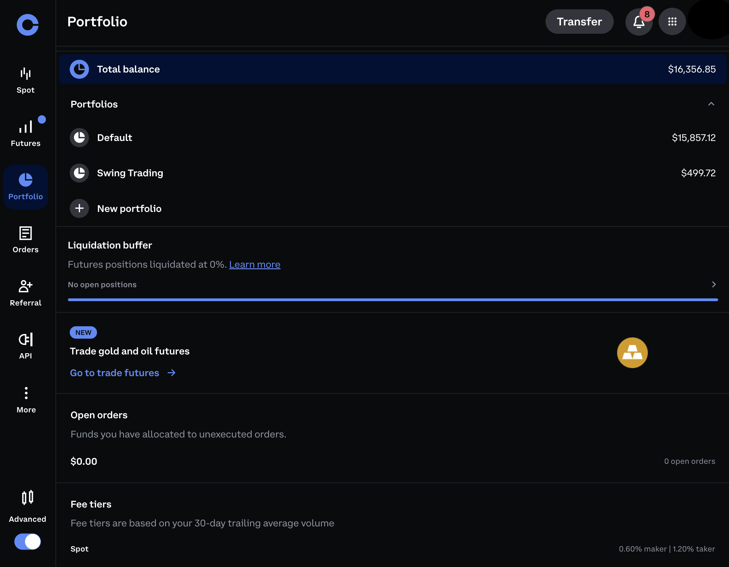 Once we're in Advanced Trade we can head to the portfolio view and see all of our active portfolios or choose to add a new one